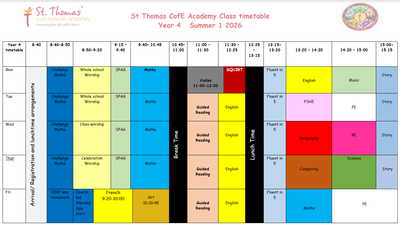 PE – Year 4 PE days will be Thursday and Friday this half-term. Please ensure children come to school wearing their PE kit, with long hair tied up and no jewellery.